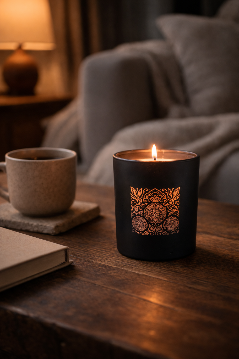 This vessel features layered floral geometry and balanced symmetry influenced by ceremonial patterns. When lit, the design reveals a warm, grounding glow.