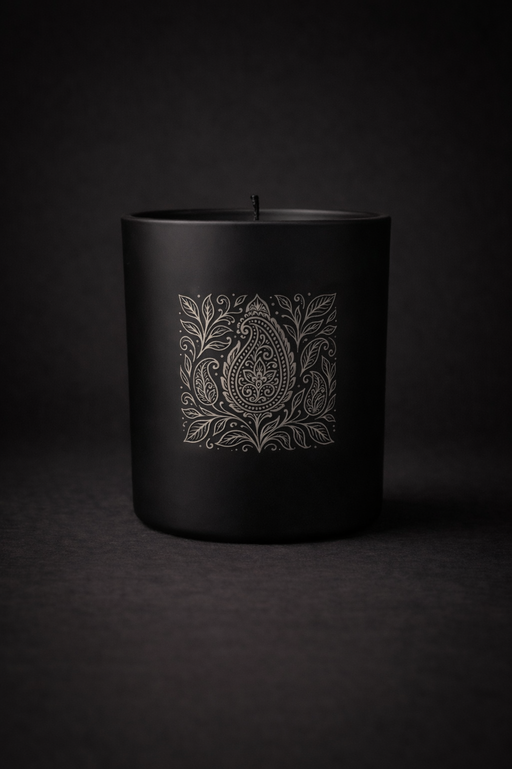 Each candle is housed in a matte black glass jar, etched with an Indian textile inspired motif.
