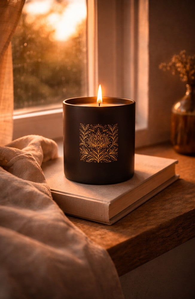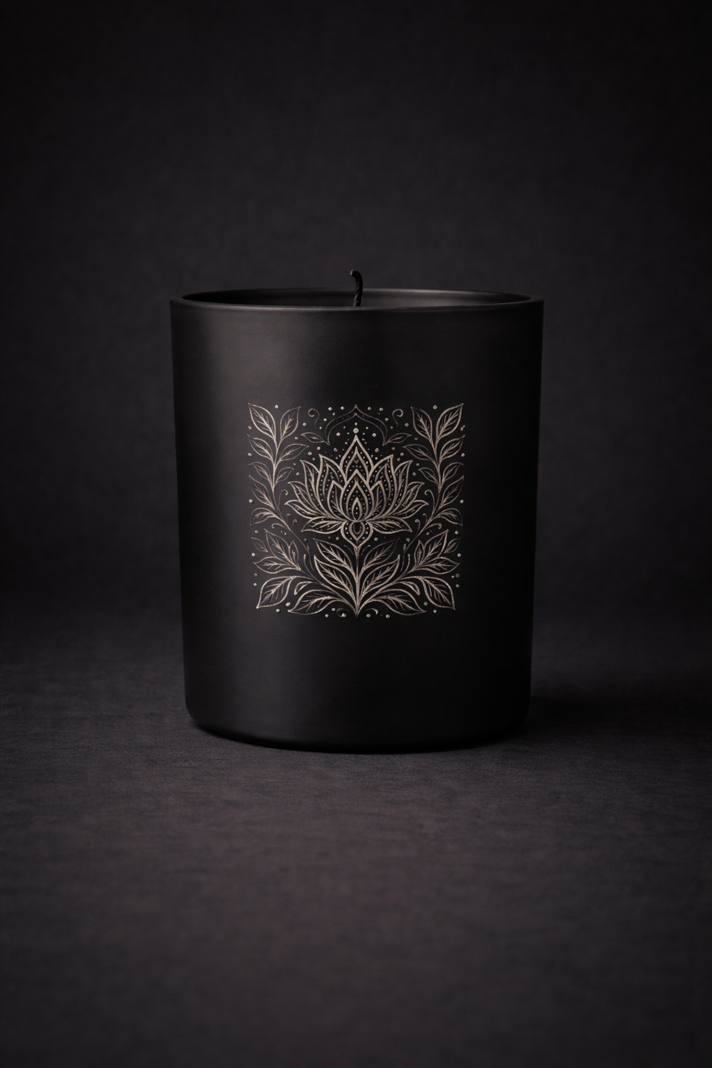 Each candle is housed in a matte black glass jar, etched with an Indian textile inspired motif.