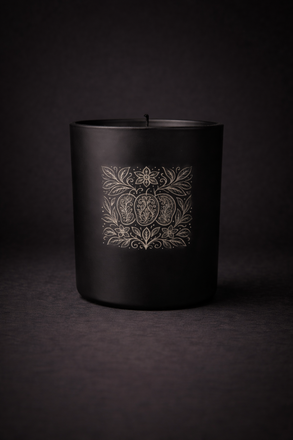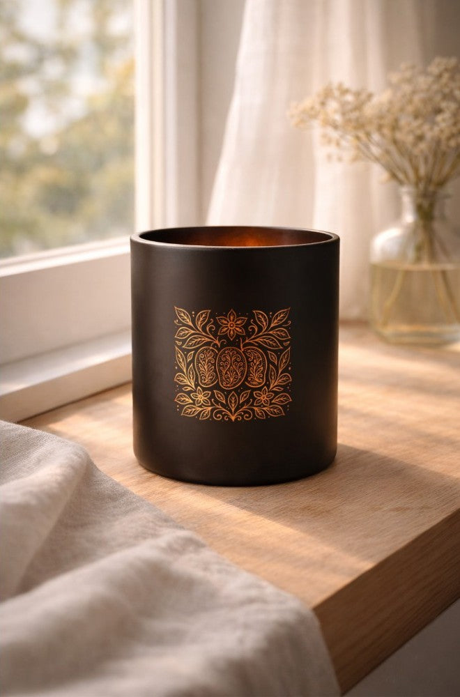 Each candle is housed in a matte black glass jar, etched with an Indian textile inspired motif.